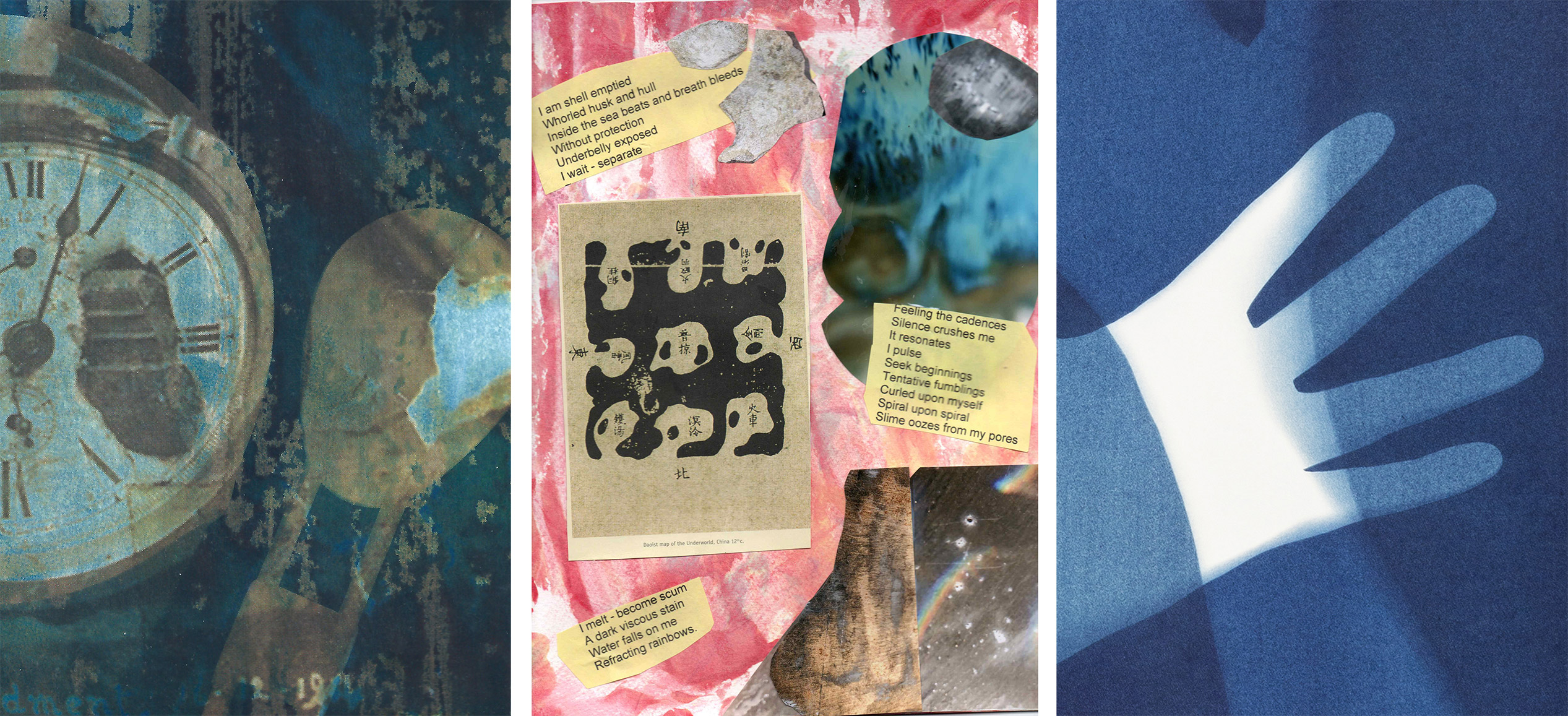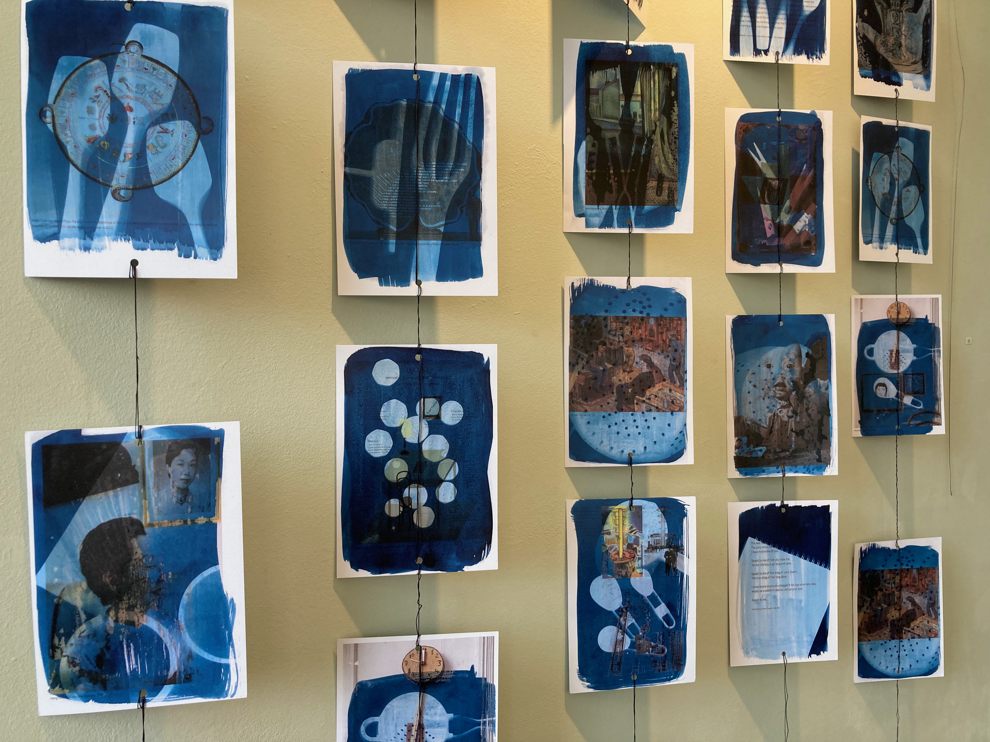 ‘Home Time 2020’ was shown in 2021 at the Turner House Open in Penarth near Cardiff. Four original cyanotypes made during the first lockdown were presented framed. The complete series was reprinted and hung to make a large hanging piece which was shown as part of ‘Lost?’ A Shared Walk exhibition August – November 2021 at The Red House Merthyr and at Aberdare Museum in January 2022.